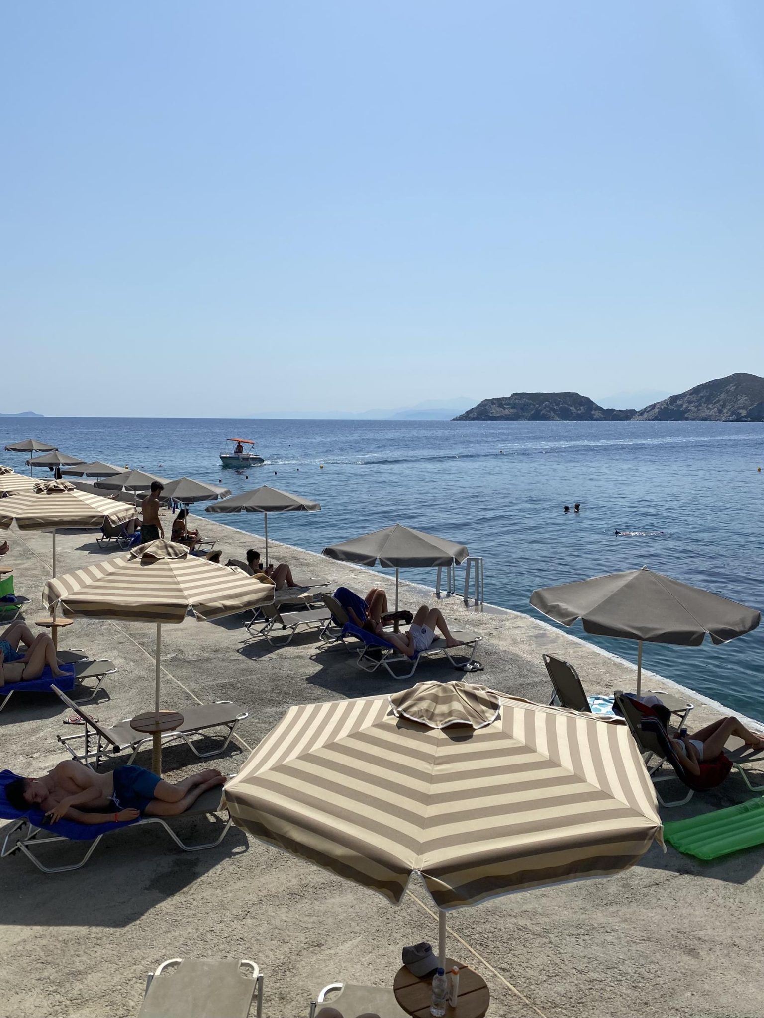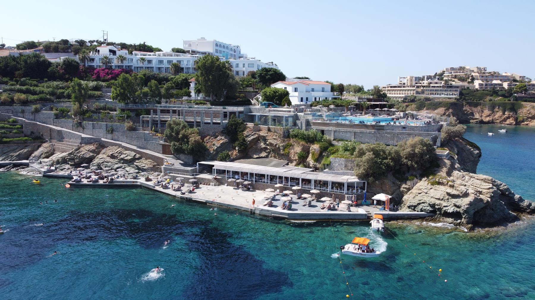 You will find the Tsimento Beach Bar at the cliff’s base. A magical spot, perched on a concrete platform by the sea. The crystal clear waters of this cove make it one of the most popular seaside locales in Heraklion. An ideal place to laze under the sun with a refreshing cocktail in hand.